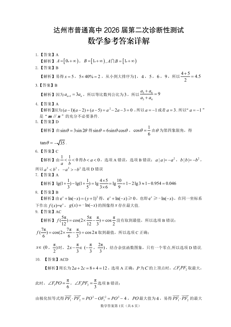 达州市普通高中2026届第二次诊断测试 数学答案详解.pdf