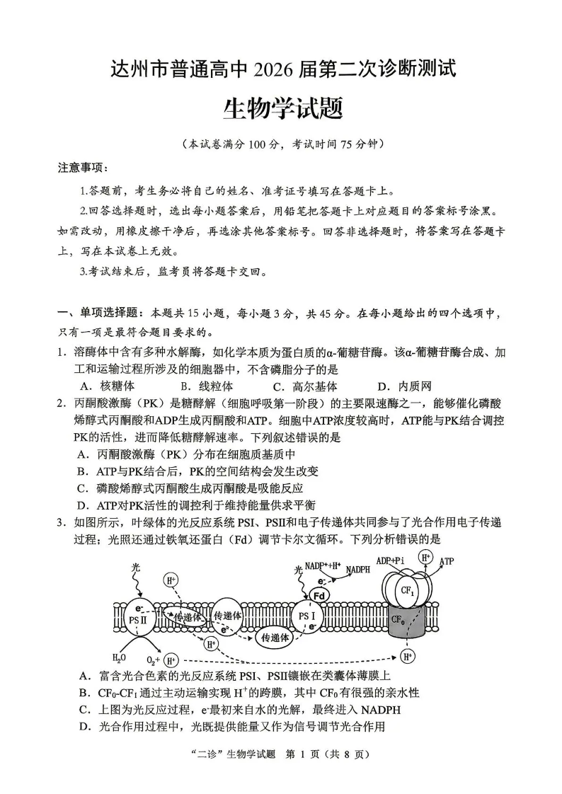 达州市普通高中2026届第二次诊断测试 生物.pdf