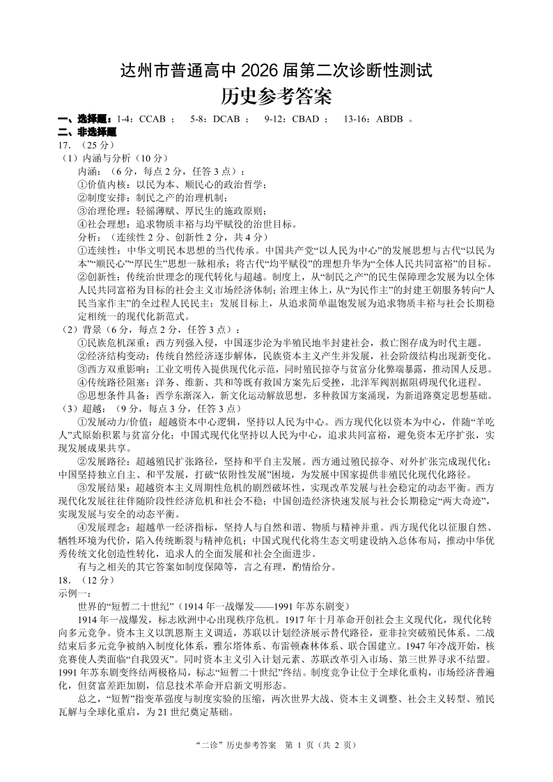 达州市普通高中2026届第二次诊断测试 历史答案.pdf