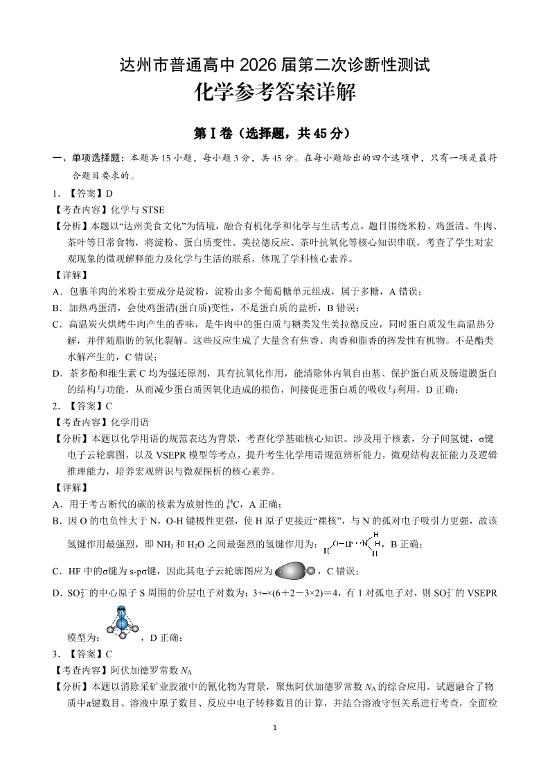 达州市普通高中2026届第二次诊断测试 化学答案详解.pdf