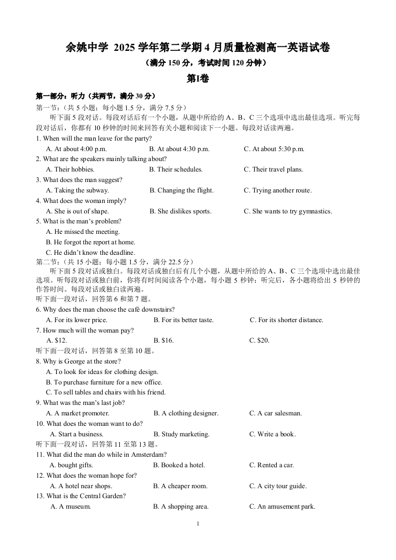 浙江省余姚中学2025-2026学年高一下学期4月质量检测 英语.pdf