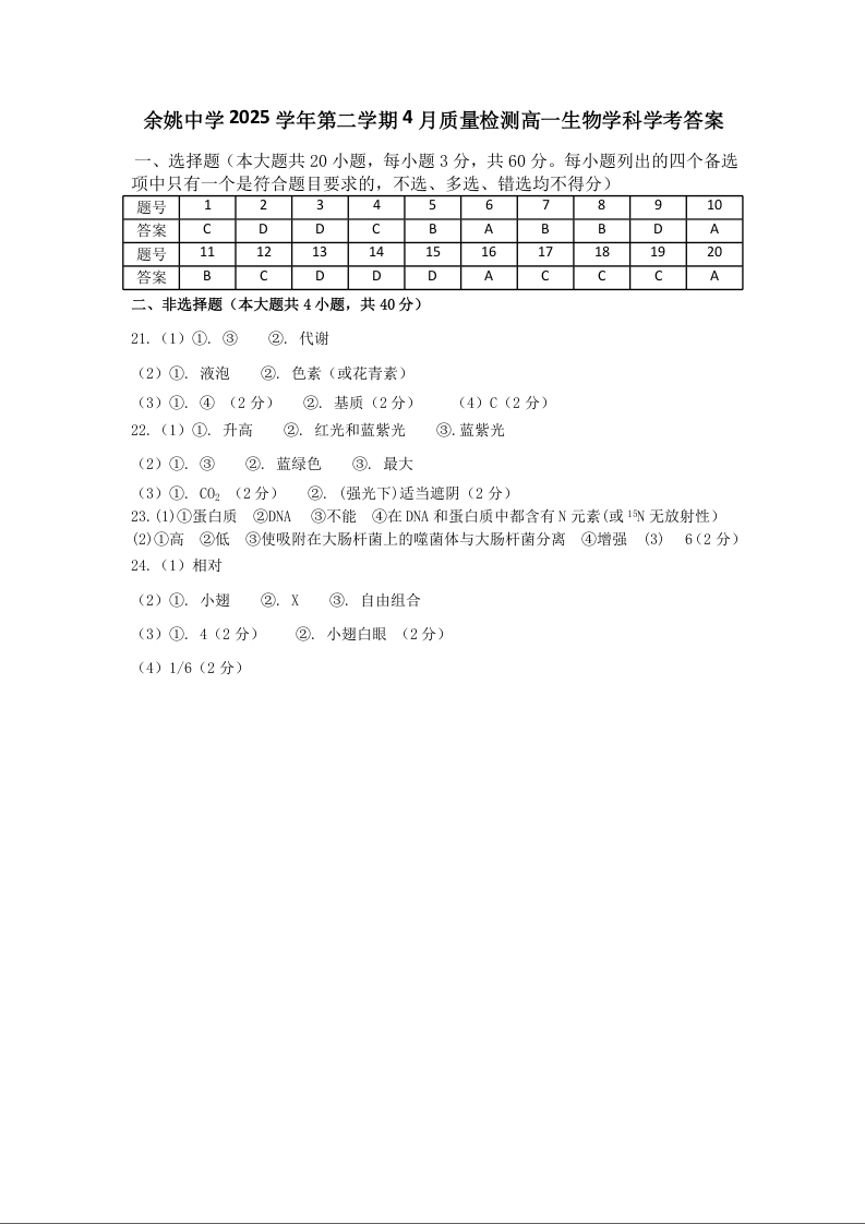 浙江省余姚中学2025-2026学年高一下学期4月质量检测 生物答案.docx