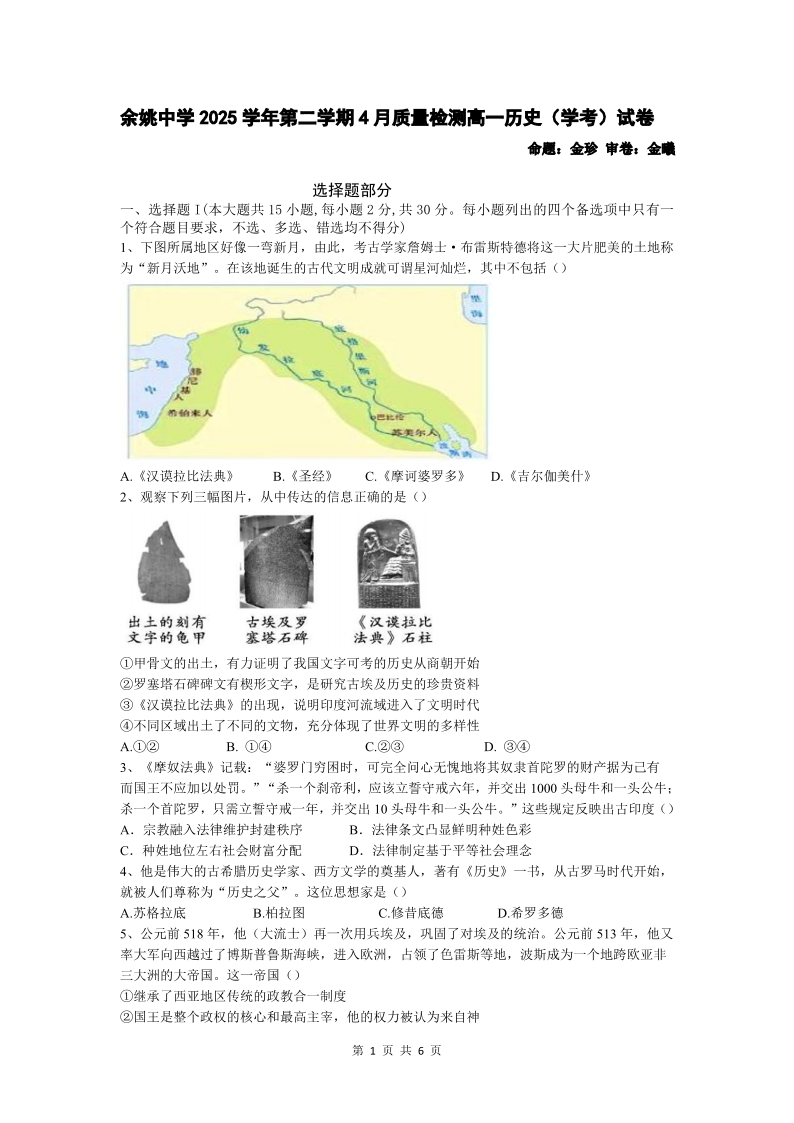 浙江省余姚中学2025-2026学年高一下学期4月质量检测 历史.pdf