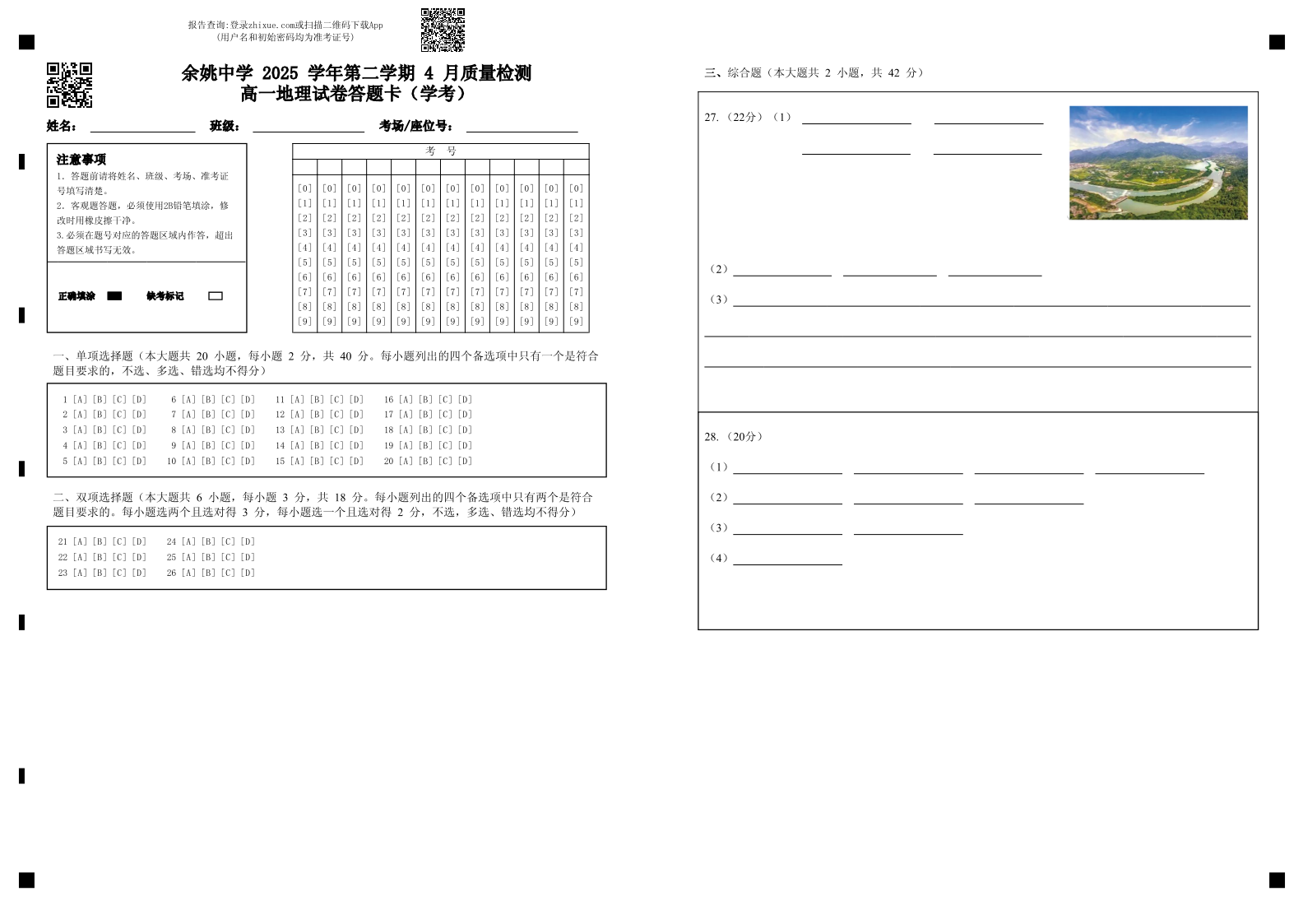 浙江省余姚中学2025-2026学年高一下学期4月质量检测 地理答题卡.pdf