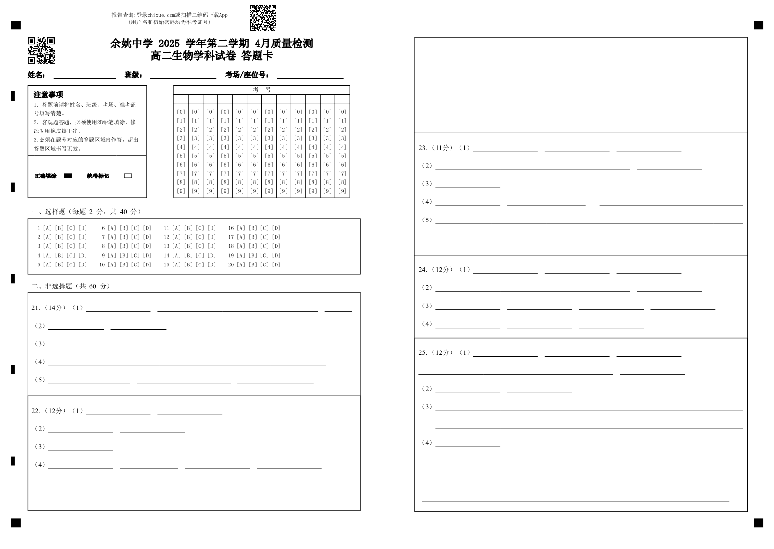 浙江省余姚中学2025-2026学年高二下学期4月质量检测 生物答题卡.pdf