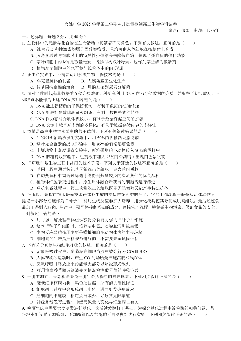 浙江省余姚中学2025-2026学年高二下学期4月质量检测 生物.pdf