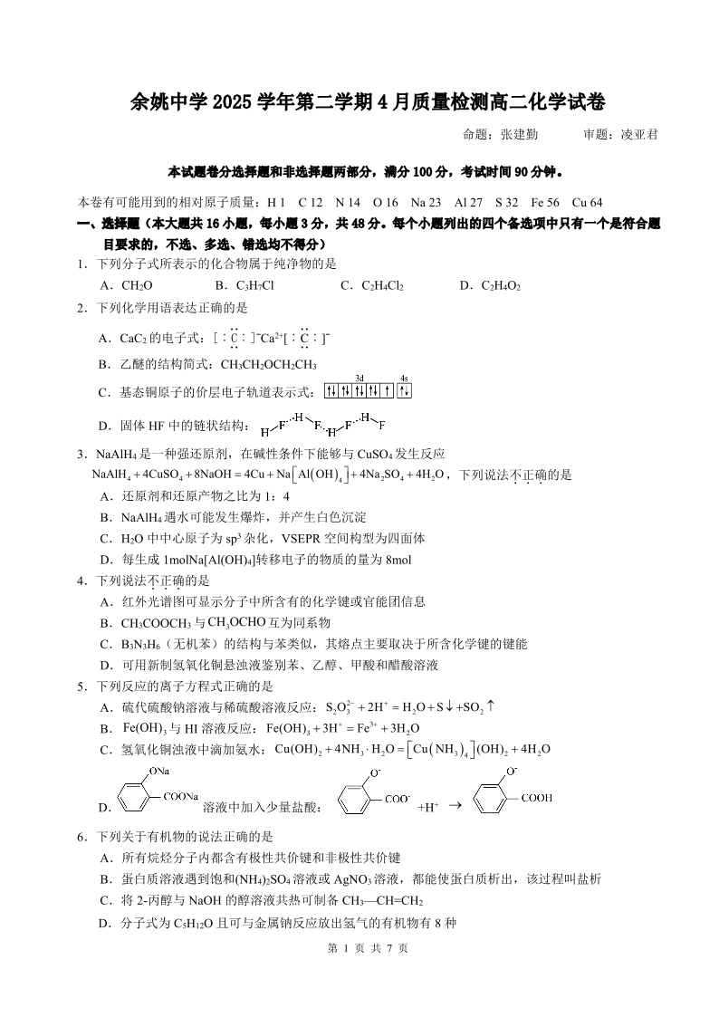 浙江省余姚中学2025-2026学年高二下学期4月质量检测 化学.pdf