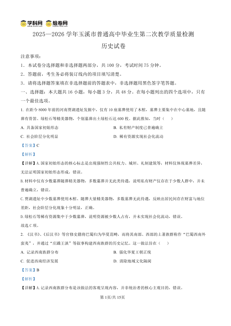 2025一2026学年玉溪市普通高中毕业生第二次教学质量检测 历史答案.pdf
