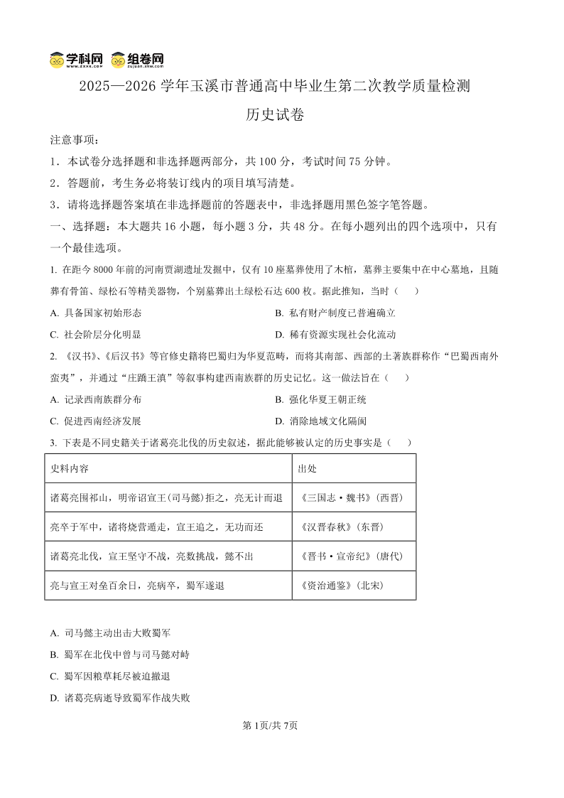2025一2026学年玉溪市普通高中毕业生第二次教学质量检测 历史.pdf