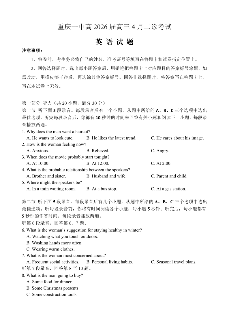 重庆一中高2026届高三下学期4月二诊考试 英语.pdf