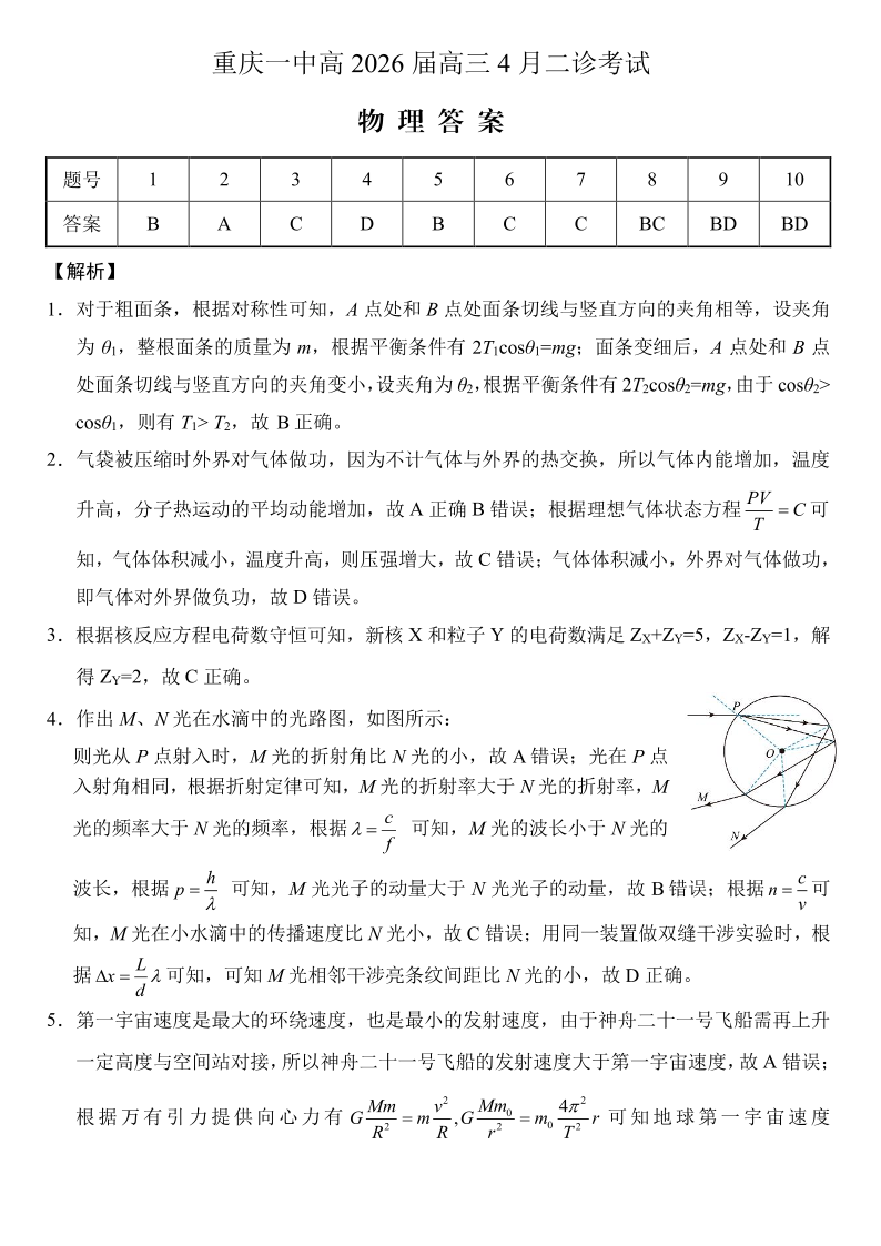 重庆一中高2026届高三下学期4月二诊考试 物理答案.pdf