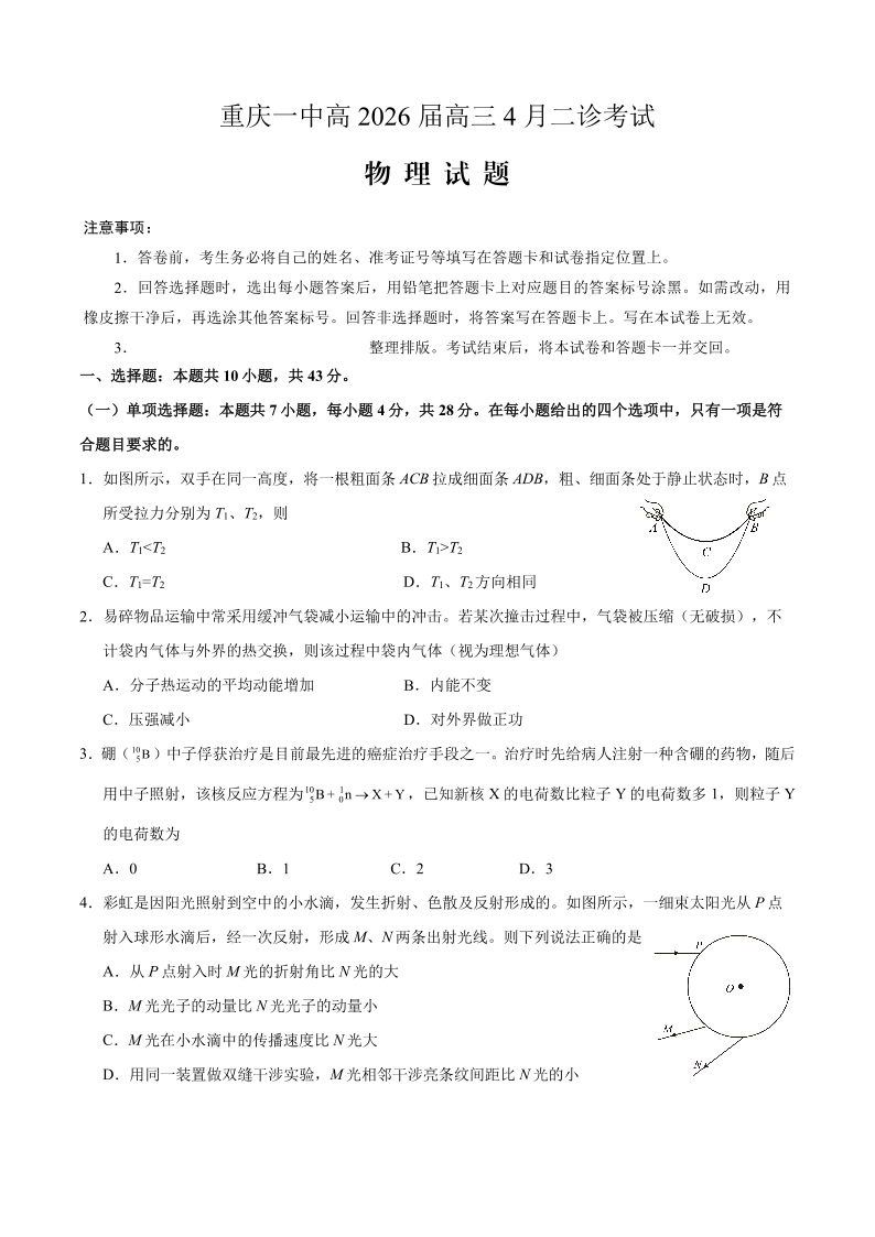 重庆一中高2026届高三下学期4月二诊考试 物理.pdf
