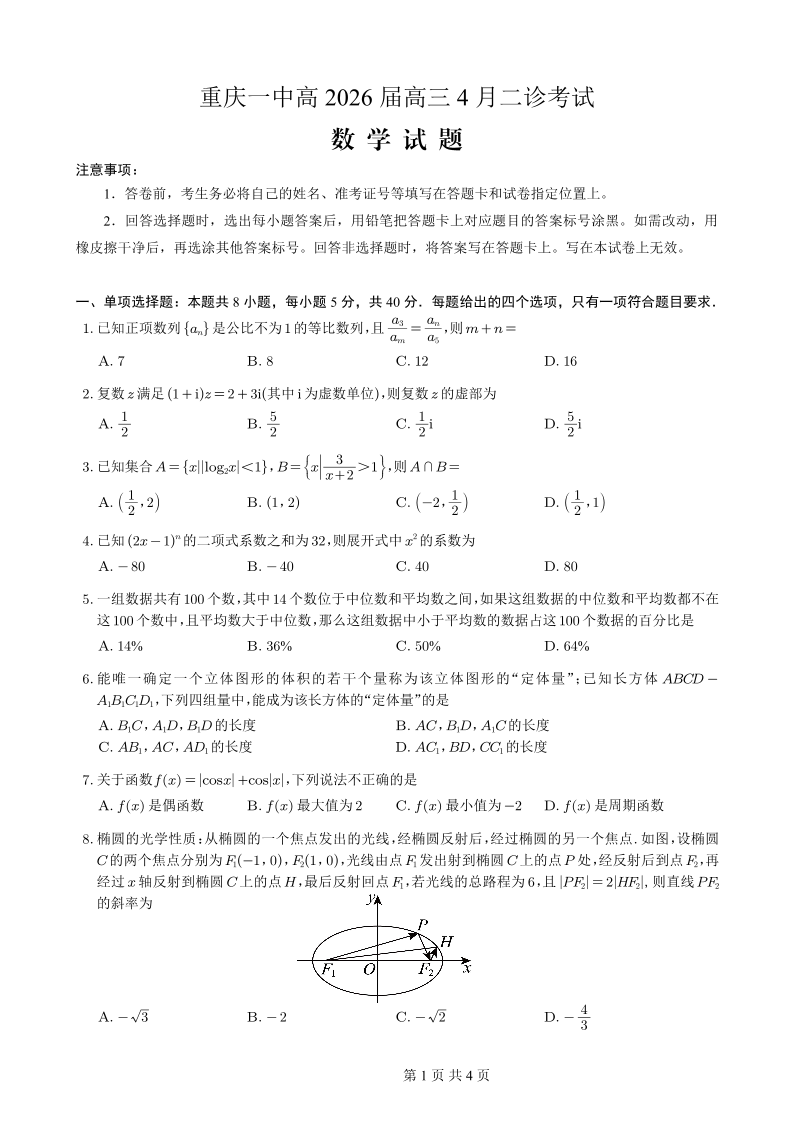重庆一中高2026届高三下学期4月二诊考试 数学.pdf