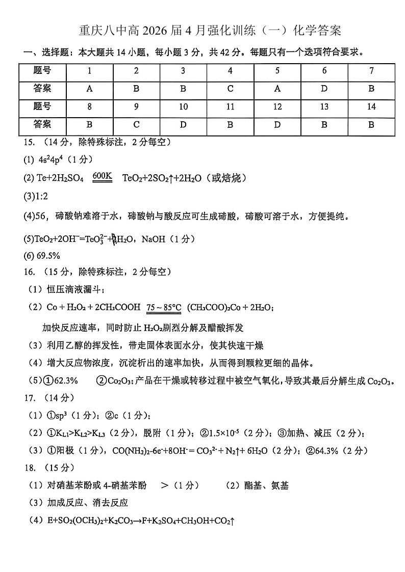 重庆八中高2026届4月强化训练(一)化学答案.pdf