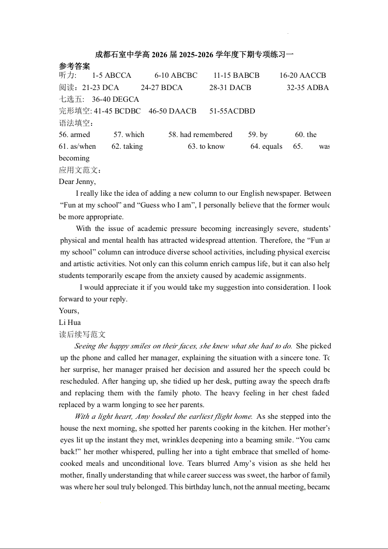成都石室中学2025-2026学年度上期高2026届专项练习一 英语答案.docx