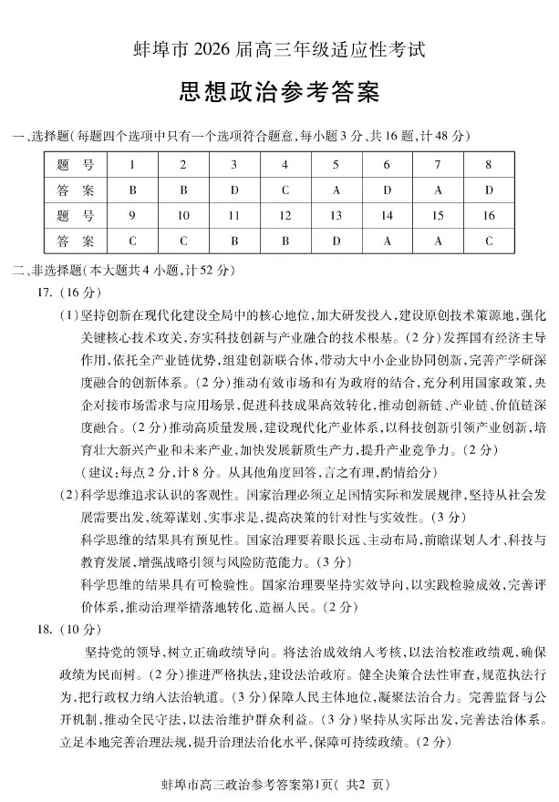 蚌埠市2026届高三年级适应性考试 政治答案.pdf