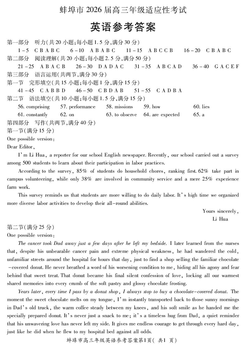 蚌埠市2026届高三年级适应性考试 英语答案.pdf