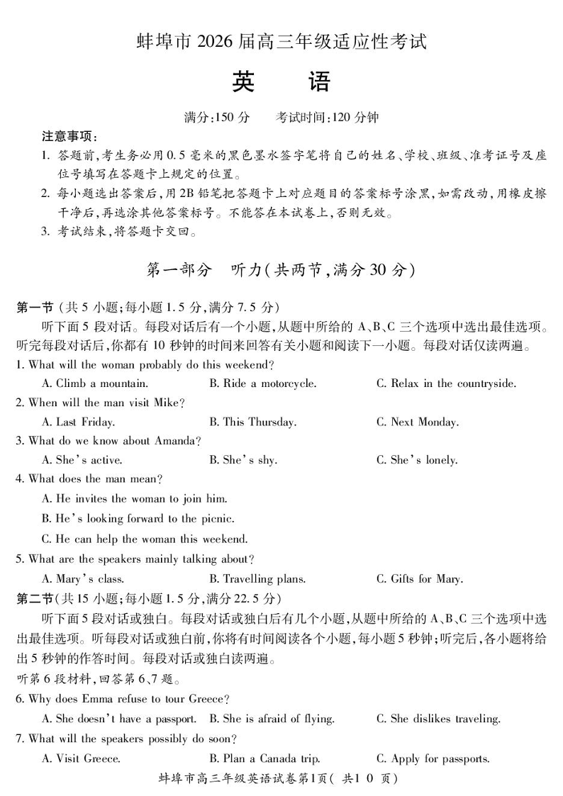 蚌埠市2026届高三年级适应性考试 英语.pdf