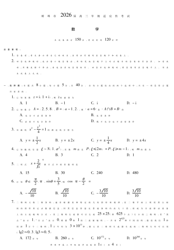 蚌埠市2026届高三年级适应性考试 数学.pdf