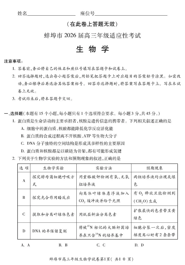 蚌埠市2026届高三年级适应性考试 生物.pdf