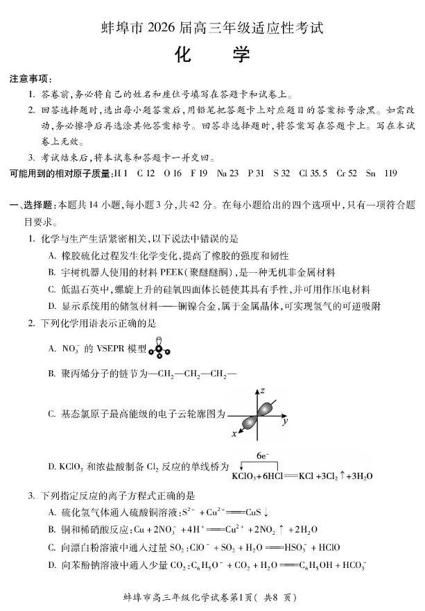 蚌埠市2026届高三年级适应性考试 化学.pdf