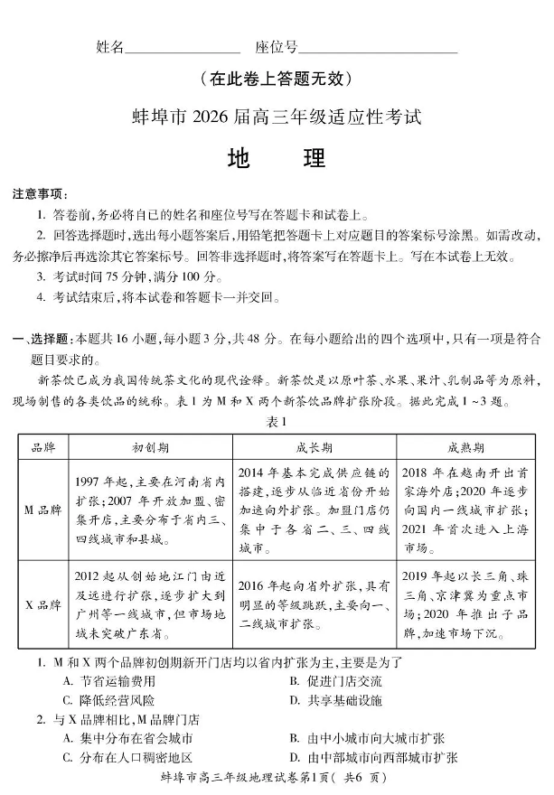 蚌埠市2026届高三年级适应性考试 地理.pdf