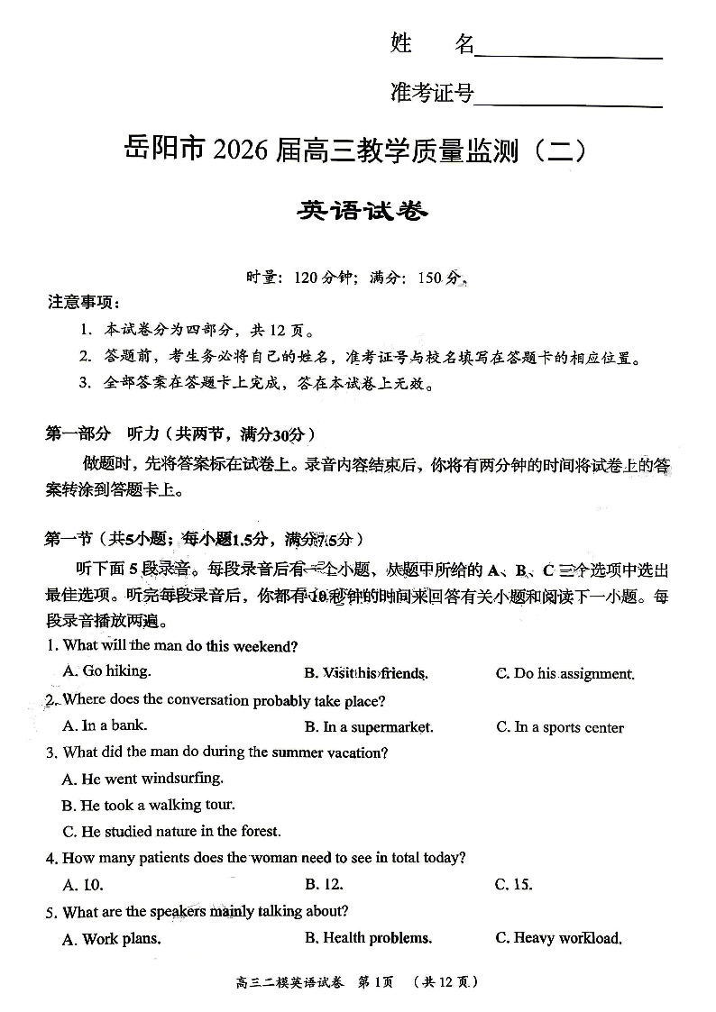 湖南省岳阳市2026届高三教学质量监测(二)英语.pdf