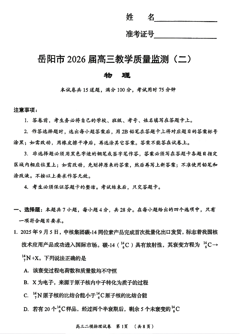 湖南省岳阳市2026届高三教学质量监测(二)物理.pdf