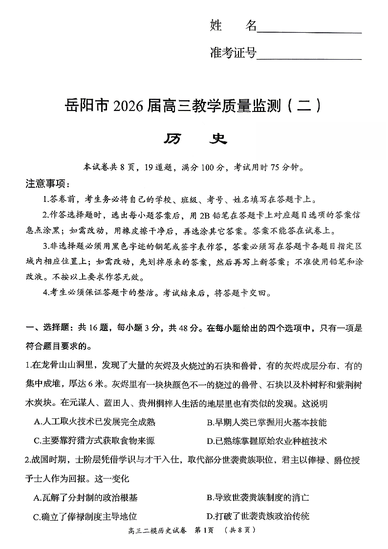 湖南省岳阳市2026届高三教学质量监测(二)历史.pdf
