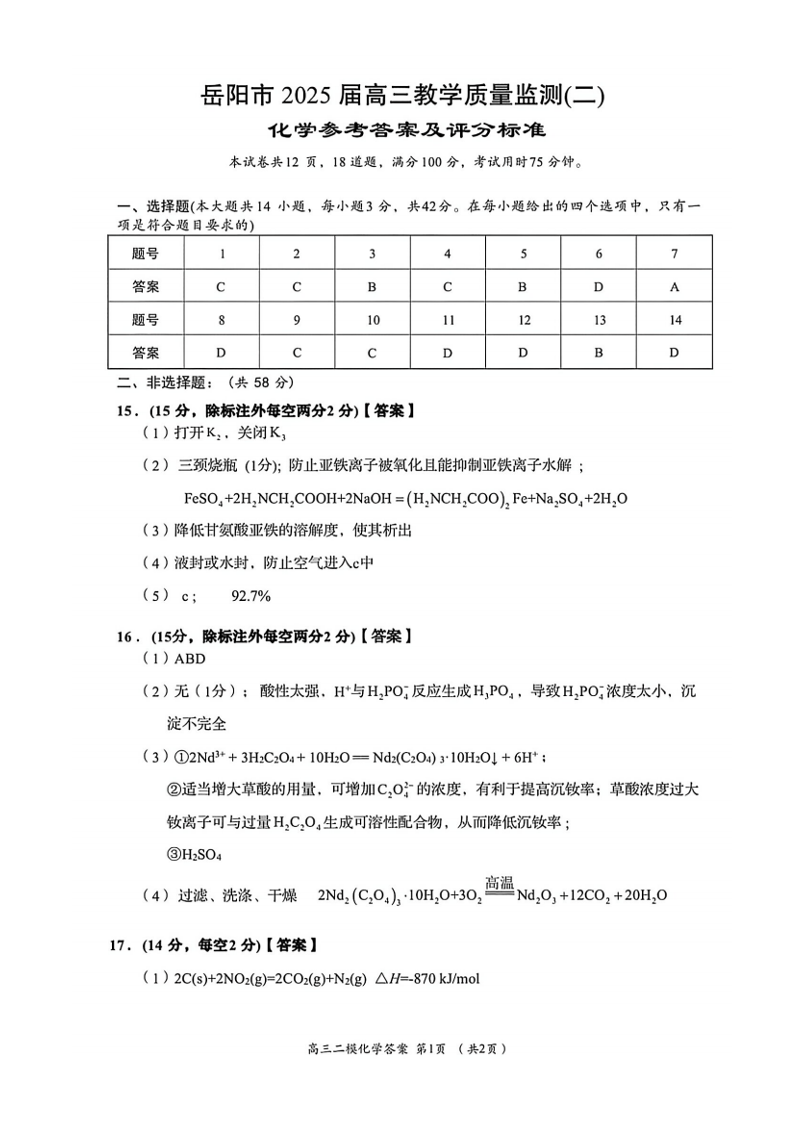 湖南省岳阳市2026届高三教学质量监测(二)化学答案.pdf