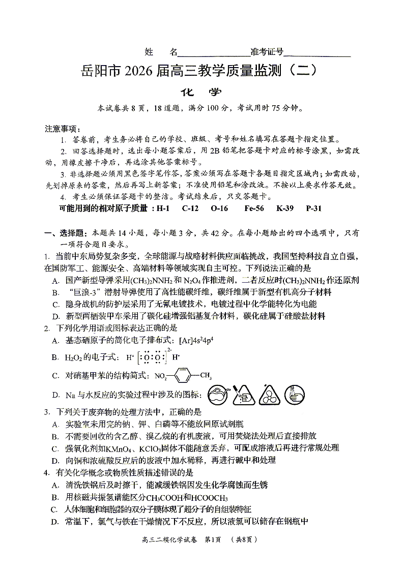 湖南省岳阳市2026届高三教学质量监测(二)化学.pdf