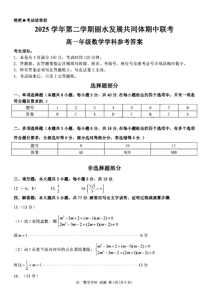 丽水发展共同体2025学年高一第二学期期中联考 数学答案.pdf