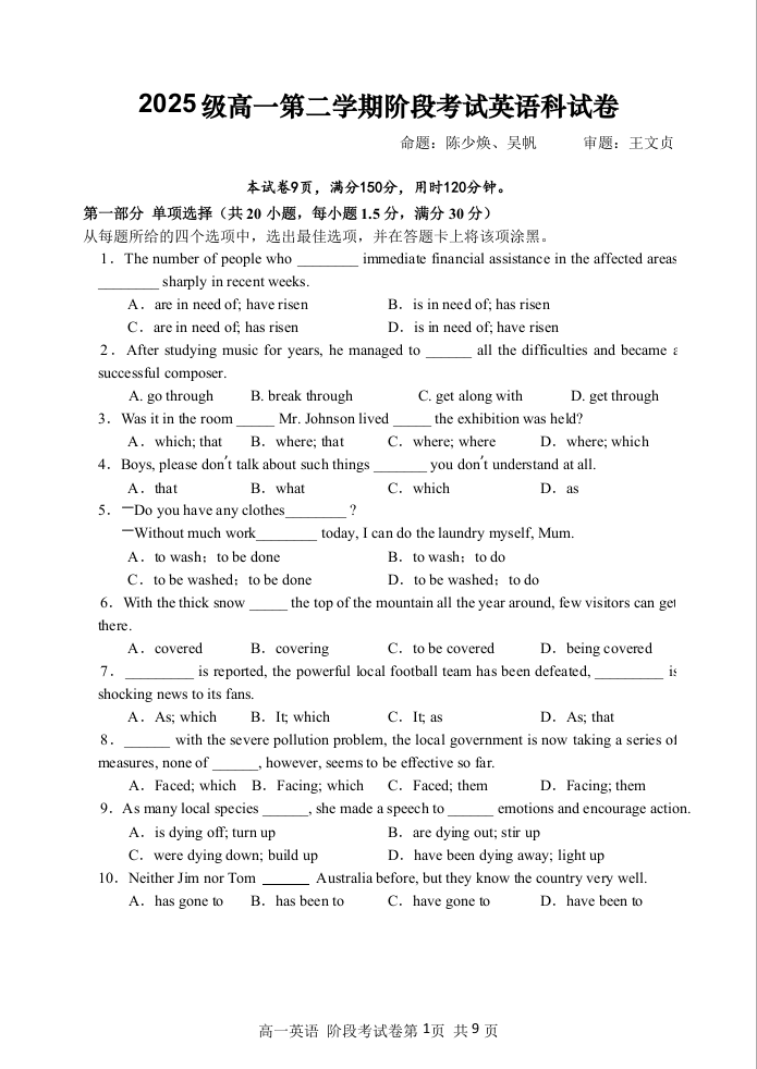 广东省汕头市金山中学2025-2026学年高一下学期阶段性考试 英语.docx