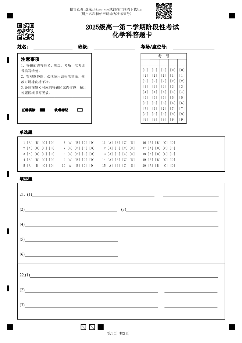广东省汕头市金山中学2025-2026学年高一下学期阶段性考试 化学答题卡.pdf