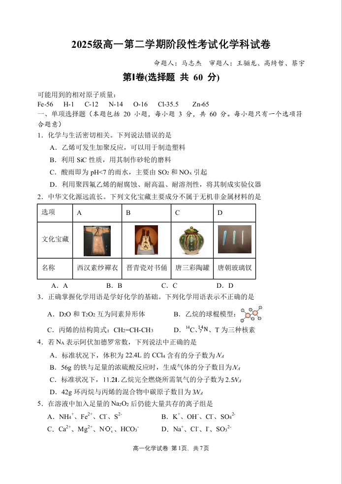 广东省汕头市金山中学2025-2026学年高一下学期阶段性考试 化学.docx