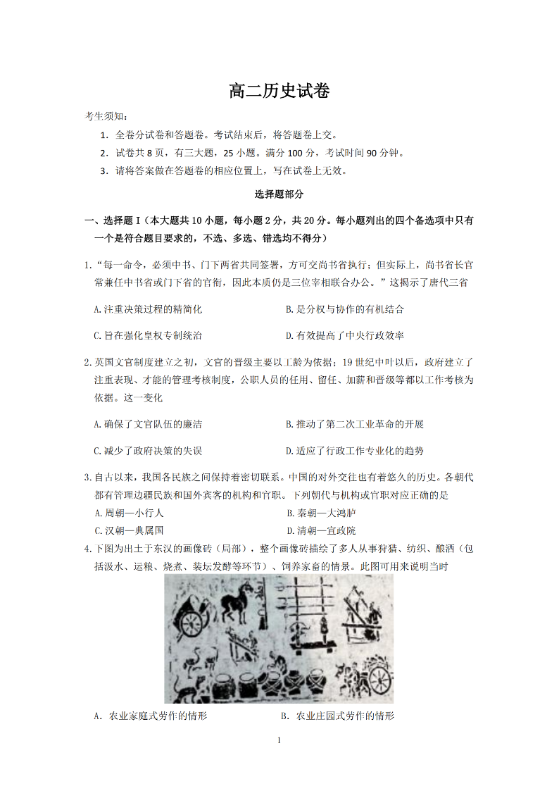 衢州五校联盟2025学年高二第二学期期中联考 历史.pdf