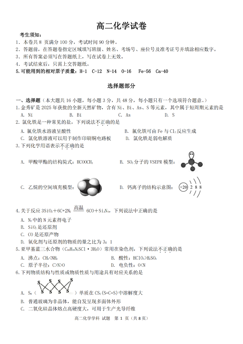 衢州五校联盟2025学年高二第二学期期中联考 化学.pdf