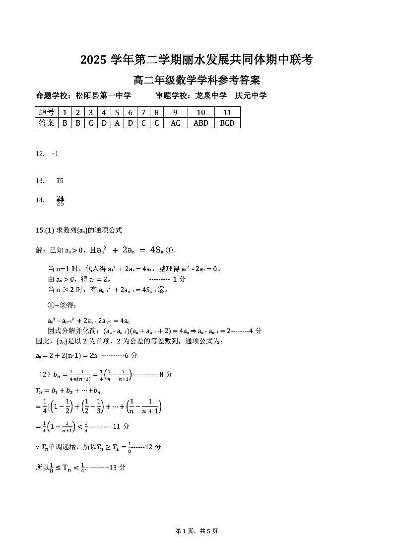 丽水发展共同体2025学年高二第二学期期中联考 数学答案.pdf