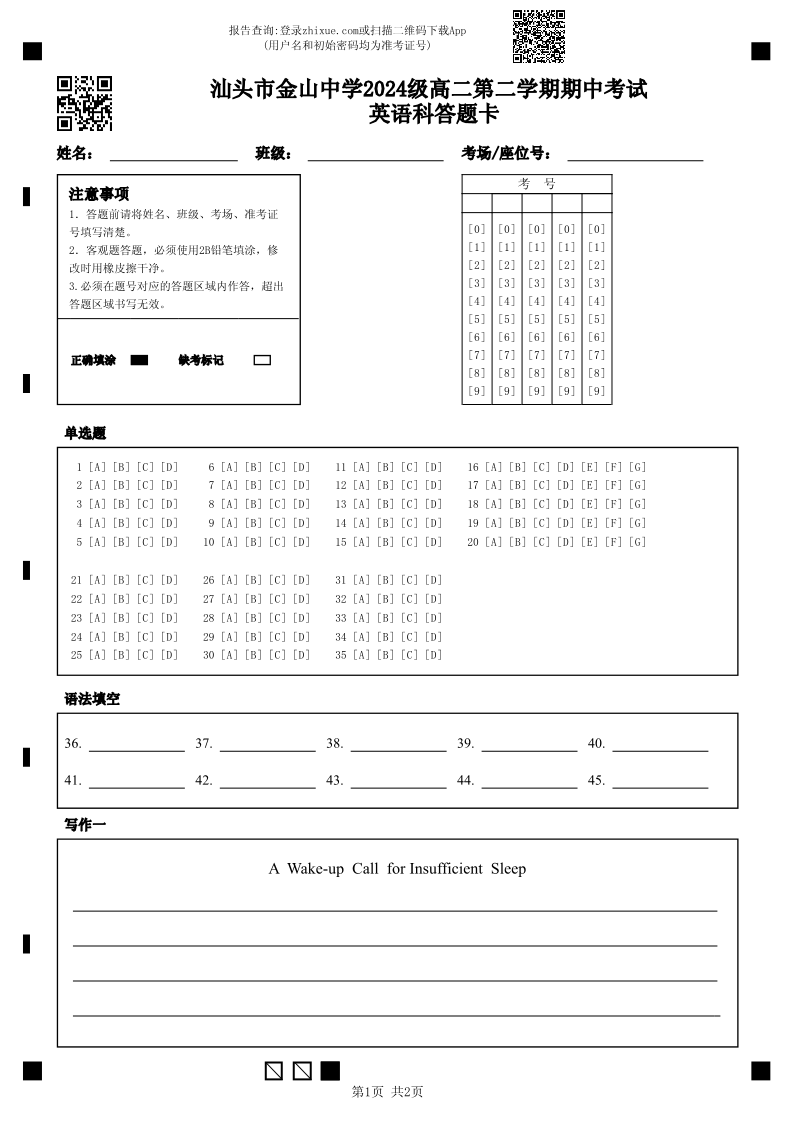 广东省汕头市金山中学2025-2026学年高二下学期期中考试 英语答题卡.pdf