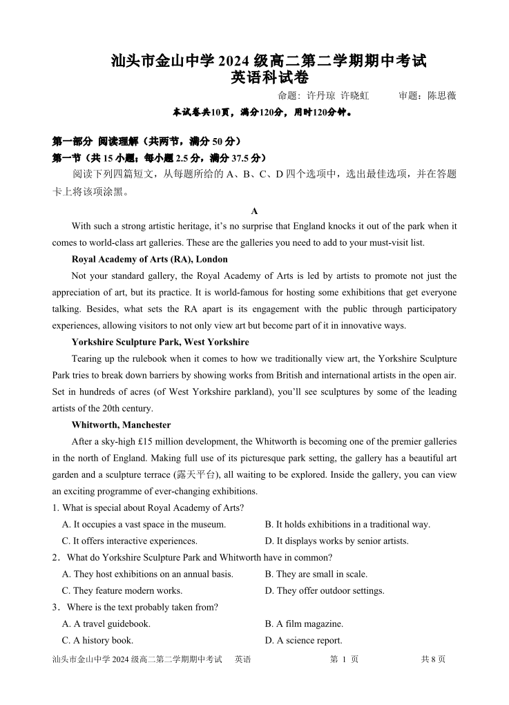 广东省汕头市金山中学2025-2026学年高二下学期期中考试 英语.pdf