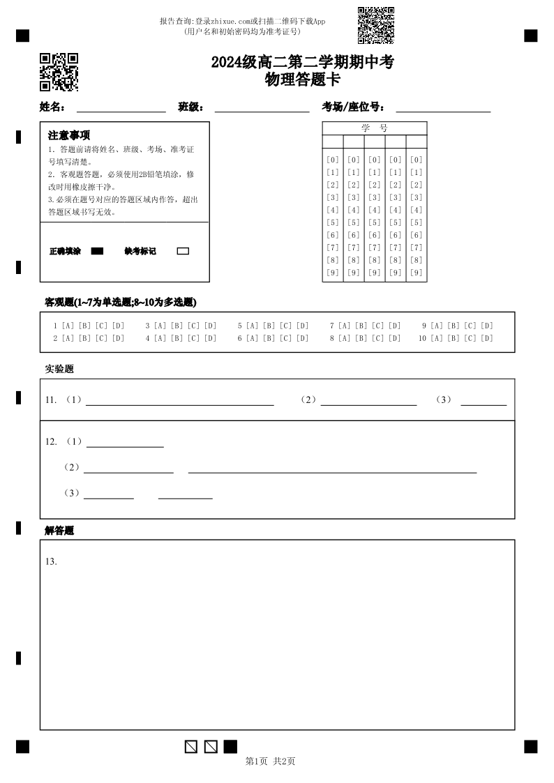 广东省汕头市金山中学2025-2026学年高二下学期期中考试 物理答题卡.pdf