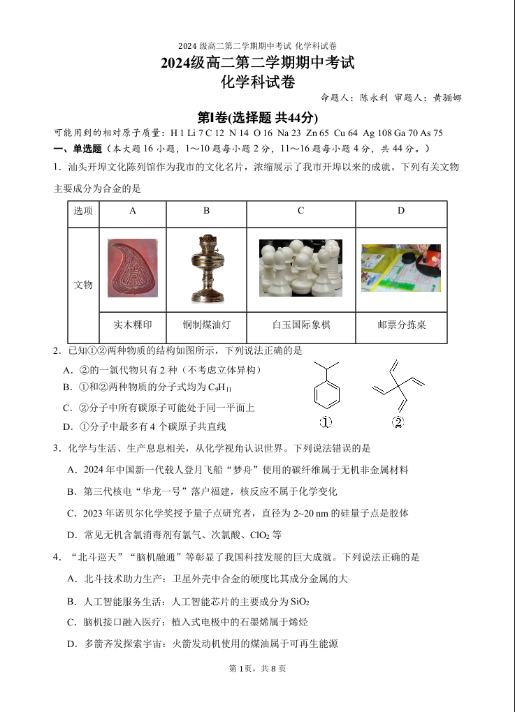 广东省汕头市金山中学2025-2026学年高二下学期期中考试 化学.docx