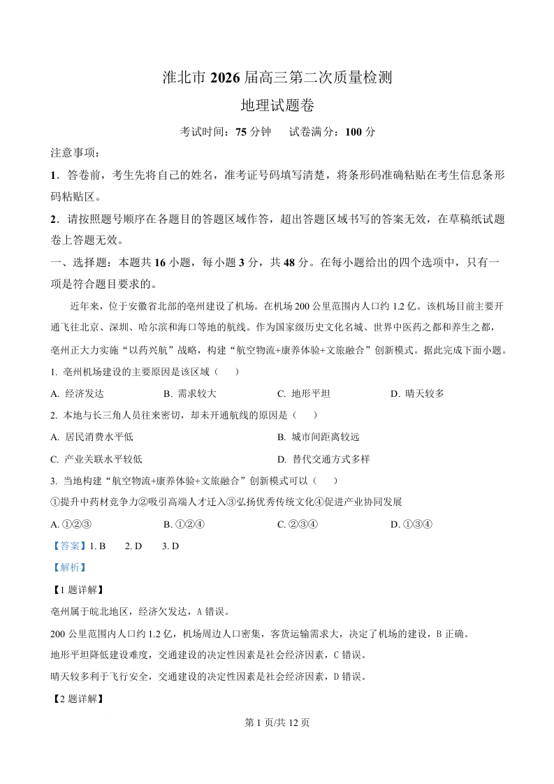 淮北市2026届高三第二次质量检测 地理答案.docx