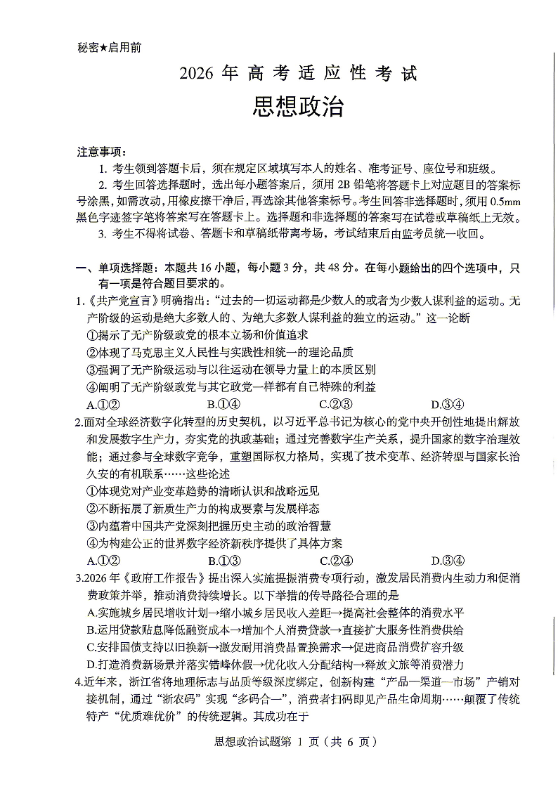 绵阳市2026年高考适应性考试 政治.pdf