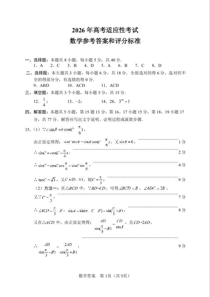 绵阳市2026年高考适应性考试 数学答案.docx