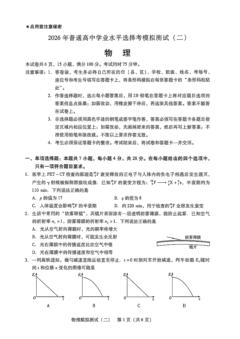广东省2026年普通高等学校招生全国统一考试模拟测试(二)物理.pdf