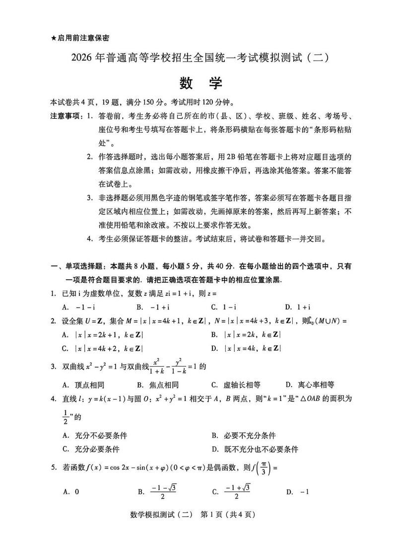 广东省2026年普通高等学校招生全国统一考试模拟测试(二)数学.pdf