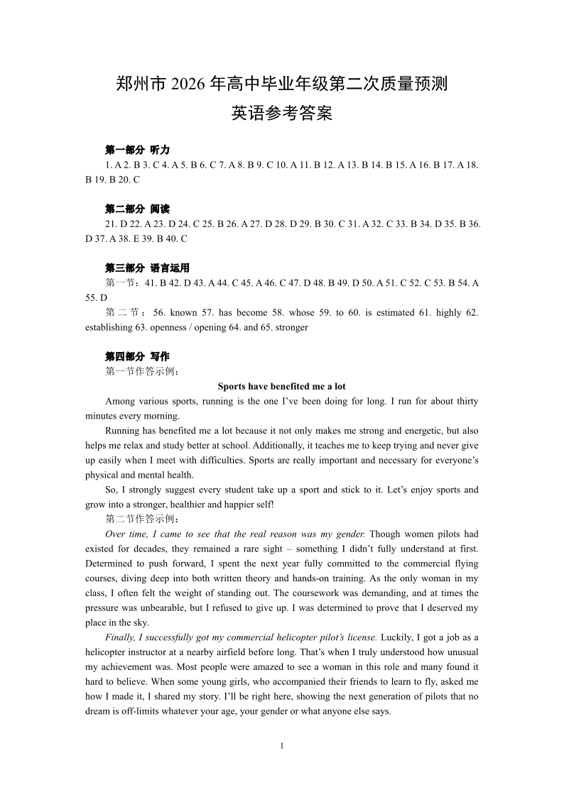 郑州市2026年高中毕业年级第二次质量预测 英语答案.pdf