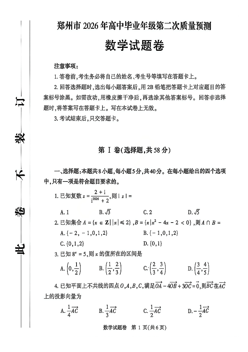 郑州市2026年高中毕业年级第二次质量预测 数学.pdf