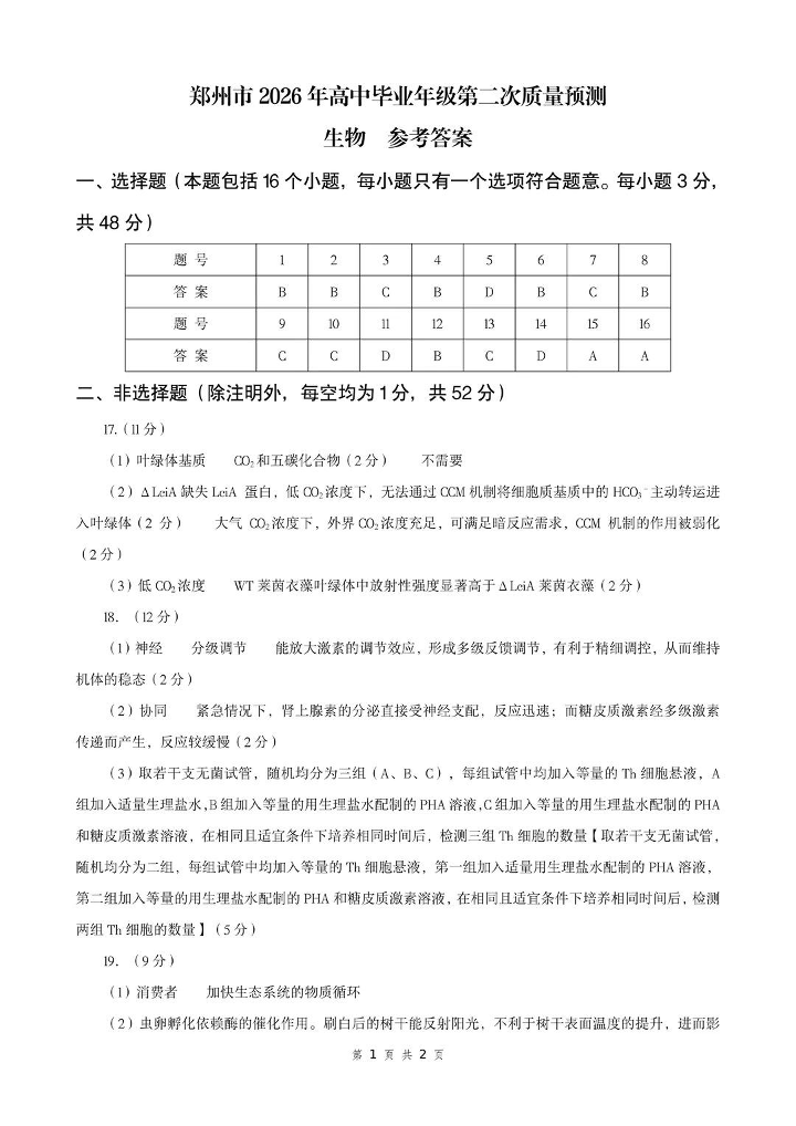 郑州市2026年高中毕业年级第二次质量预测 生物答案.pdf